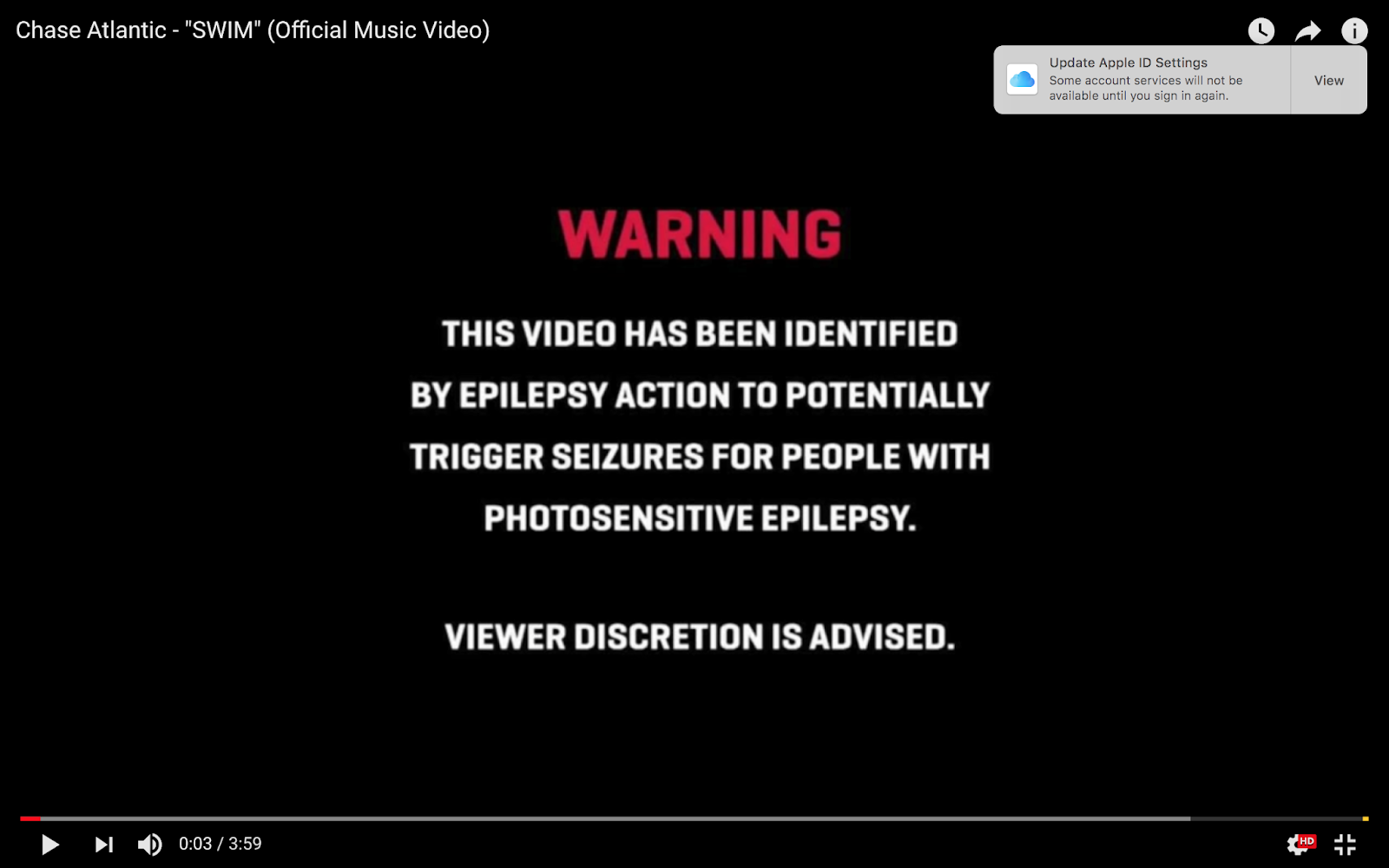 You can also see in this video, many locations used, for example, at the start of the video the artist trio stands on a cliff, then later you see shots of the lead singer of the trio in a club setting. This music video has a title at the start with the artist's name - 'Chase Atlantic'. There is also a title before that which warns the audience/viewer that this video has a lot of flashing image and can be harmful to people with epilepsy. This is become quite an important thing to do lately, informing the viewer about the video in case they have epilepsy.